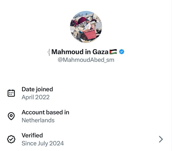 Many of the accounts of private individuals claiming to be living through the ‘genocide’ in Gaza are not in fact located in Gaza, or Palestine. Ameer in Gaza posts about starving and asks for donations, but is geolocated to the UK. Mahmoud in Gaza is in the Netherlands. “Dima Alghrbawi” raised $34,000 while operating from Nigeria…